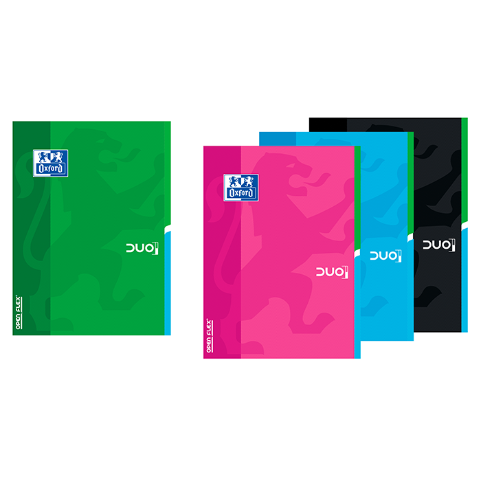 En primer lugar, en libreta grapada tenemos OPENFLEX DUO. Esta libreta que utiliza el sistema Openflex®, patentado por OXFORD, que permite una apertura y un cierre total de 180º.