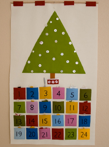 2. ¡Este está hecho con fieltros! Solo necesitas cartulinas de colores y fieltro. Elige un regalito para cada día y explícales que para poder cogerlos tienen que haberse portado bien durante el día.