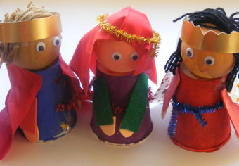 Finalmente, creáis un cuadro de tela en la cabeza para crear un pañuelo y las coronas, y pegadlos con pegamento. Solo queda añadir los ojos y dibujar las caras de cada rey.