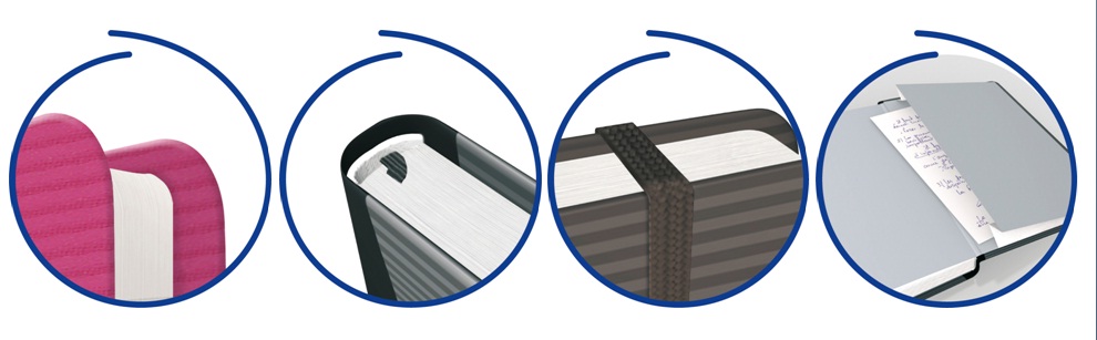 – Tapas “Infinium” – Tapas de un material innovador, tan resistentes como el plástico pero con el tacto del papel y que permiten mantener la libreta abierta 180° para escribir cómodamente.